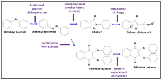 - Jamier, V.; Ba, L.A.; Jacob, C. Selenium- and tellurium-containing multifunctional redox agents as biochemical redox modulators with selective cytotoxicity. Chem. Eur. J. 2010, 16, 10920–10928. [Google Scholar] [CrossRef] [PubMed]