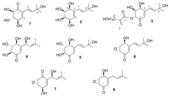 For compound 2, a brown viscous liquid, the molecular formula C11H18O5 was assigned, which has three degrees of unsaturation according to its HR-ESI-TOF-MS data ([M + Na]+, m/z 253.1034, calcd. 253.1046 for C11H18O5Na). The ion at m/z 235.0940 (100%) in the mass spectrum corresponded to the loss of water [M + Na − H2O]+, which was confirmed by an MS2 experiment. The IR spectrum showed a band at 3300 cm−1 corresponding to hydroxyl groups, although no signal for a carbonyl group was observed. The COSY and HMBC experiments (Figure 3A) confirmed the presence of an isoprenyl unit as in compound 1 (δH 1.30 (s); δC 29.9), a quaternary sp3 oxycarbon (δC 71.4) and two sp2 methines (δH 6.15, 6.24 (d); δC 126.5, 140.9). Above, 2 showed a quaternary sp2 carbon (δC 136.5), an sp2 methine (δH 5.67 (br t); δC 125.9) and four sp3 oxymethines (δH 3.37 (t), 3.49 (br m), 4.35 (d), 4.59 (br d); δC 57.1, 56.0, 63.9, 65.3).