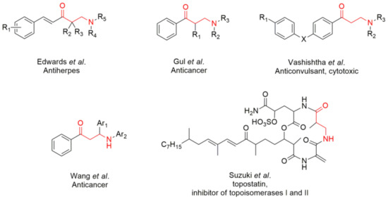In particular, the three-component one-pot Mannich reaction allows the formation of β-amino ketones, presenting general structure A or B (Figure 2) with great structural variability, depending on the amine and aldehyde employed [27,28].