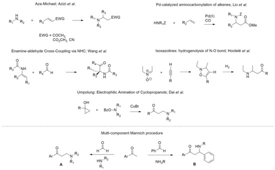 While many synthetic strategies to achieve β-amino carbonyl compounds can be found in the recent literature (Figure 2), such as aza-Michael reaction [20], enamine-aldehyde cross-coupling via N-heterocyclic carbenes [21], copper-catalyzed electrophilic amination of cyclopropanols [22], Pd-catalyzed aminocarbonylation of alkenes [23], and hydrogenolysis of isoxazolines [24], the Mannich multicomponent reaction (Figure 2) remains the most used procedure [2,25], and many improvements to and implementations of the original protocol have been studied [19,26].