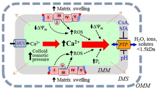 Calcium is a key inducer of both PTP-dependent and PTP-independent swelling of mitochondria (Figure 1). Cytoplasmic Ca2+ is rapidly taken up by mitochondria due to the proton-motive force generated by the ETC []. The mitochondrial calcium uniporter (MCU) is the main channel that transports Ca2+ to the matrix when PTPs are closed. In fact, the MCU is a low-affinity and high-capacity channel that mediates Ca2+ influx in a ΔΨm-dependent manner []. Mitochondrial Ca2+ efflux occurs in three ways: (i) the mitochondrial Na+/Ca2+ exchanger, the main contributor, most relevant in muscle mitochondria []; (ii) the H+/Ca2+ antiporter, an Na-independent pathway [,,]; and (iii) opening of the PTPs. The PTP opening occurs due to Ca2+ overload, inducing swelling of mitochondria caused by the influx of water and ions through the open pores [,].