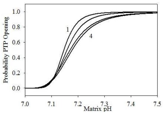 PTP opening probability in function of matrix pH, using different parametrizations: (1) α = 105, n = 6; (2) α = 104, n = 5; (3) α = 1.2 × 103, n = 4; (4) α = 103, n = 4.