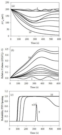 Figure 5 demonstrates time evolution plots of PPTP, ΔΨm and in function of the initial [Ca2+] at a fixed initial cytosolic [K+] of 0.1 μM. Figure 5a plots the probability of PTP opening, showing that PTP begin to open only at the initial cytosolic [Ca2+] exceeding 100 μM. At this Ca2+ concentration, the probability of PTP opening is very small and limited in time. It increases with [Ca2+], reaching unity at 200 μM, although still for a short time only. Complete PTP opening was already observed at 150 s for [Ca2+] = 300 μM, and at 100 s for [Ca2+] ≥ 400 μM. Such PTP opening dynamics coincides with an acceptable level of accuracy with the data reported earlier [,].