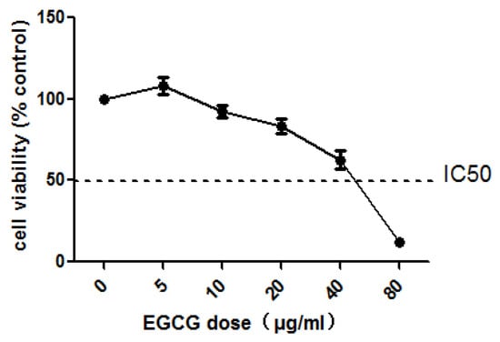 COLO205 cells were exposed to EGCG (5, 10, 20, 40, and 80 μg/mL) for 24 h. The results showed that cell number dropped to 37.33% of control when treated with 40 μg/mL EGCG (Figure 1). In mammalian cell-based genotoxicity tests, the cytotoxicity values of the maximum concentration are allowed to approach but not exceed a reduction of 55%. So, we chose the four concentrations (5, 10, 20, and 40 μg/mL) for follow-up experiments.