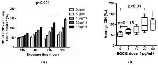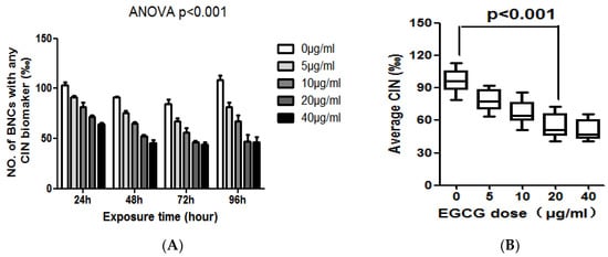 (A) The effect of EGCG on the frequency of BNC containing chromosomal instability (CIN) biomarkers (MN and/or NPB and/or NBUD); (B) The average effect of 96-h exposure to EGCG at doses of 0, 5, 10, 20, 40 μg/mL on CIN frequency in the NCM460 cell line.