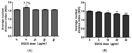 CBMN-Cyt results showed that low concentration of EGCG (5 μg/mL) could promote the proliferation of NCM460 cells. At four time points of treatment (24, 48, 72, and 96 h), the NDI with EGCG concentration of 5 μg/mL were significantly higher than other treatment groups (p < 0.05). Aside from the time, the effect of EGCG on average NDI at each concentration was discussed. Similarly, EGCG at 5 μg/mL significantly promoted the proliferation of NCM460 cells (p < 0.01) and the promotion rate was 7.7% (Figure 4A).