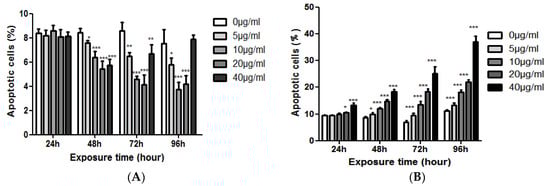 The effects of EGCG dose on apoptotic cells (%) of NCM460 (A) and COLO205 (B) cells. Significant differences between EGCG-treated groups and controls at each treatment interval are indicated by * p < 0.05, ** p < 0.01, and *** p < 0.001.