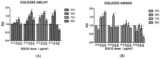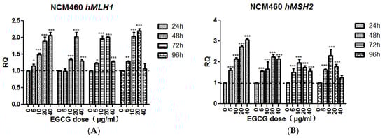 The effect of EGCG on the expression of hMLH1 (A) and hMSH2 (B) in the NCM460 cell line. Bars sharing different letters are significantly different. Significant differences between EGCG-treated groups and controls at each treatment interval are indicated by * p < 0.05, ** p < 0.01, and *** p < 0.001.