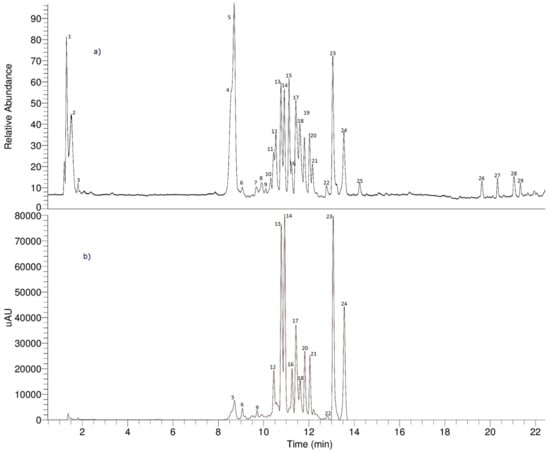 | 25 | Syringetin-3-O-hexoside | 14.24 | 254, 354 | C23H23O13− | 507.11441 | 507.11154 | −2.86 | |
