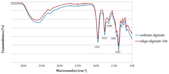 Spectroscopic analyses were performed in order to confirm whether alginates undergo any chemical modification after the depolymerization process. Sodium alginate and oligo-alginate spectrum (Figure 1) showed bands at ~1595 cm−1 and ~1410 cm−1, which is given by the antisymmetric and symmetric COO− stretch, respectively. Band at ~1300 cm−1 is assign to the skeletal vibration [58]. Peak at ~1085 cm−1 is attributed to C–O–C stretching and at ~1025 cm−1 to the OH bending of guluronate [59].