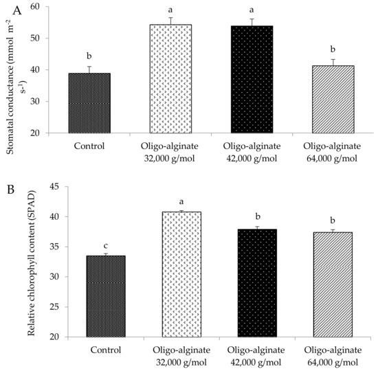 Effect of oligo-alginate with different molecular mass on stomatal conductance (A) and the relative chlorophyll content (B) of Eucomis autumnalis. Data are presented as means (±standard errors) and bars with different letters in each graph are significantly different by Tukey test (p ≤ 0.05).