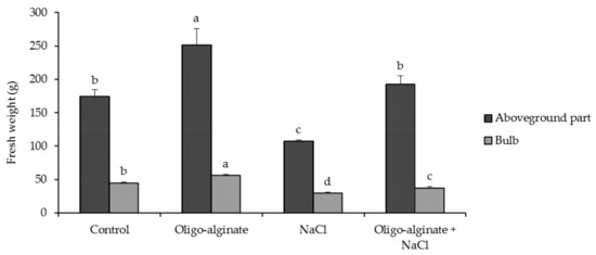 Effect of oligo-alginate and NaCl on fresh weight of above-ground part and bulb of Eucomis autumnalis. Data are presented as means (±standard errors) and bars with different letters in each graph are significantly different by Tukey Test (p ≤ 0.05).