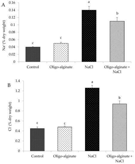 Effect of oligo-alginate and NaCl on the Na+ (A) and Cl− (B) ion concentration in leaves of Eucomis autumnalis. Data are presented as means (±standard errors) and bars with different letters in each graph are significantly different by Tukey Test (p ≤ 0.05).