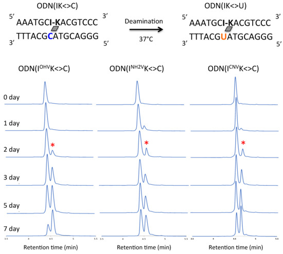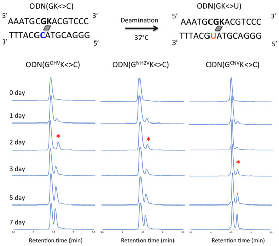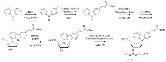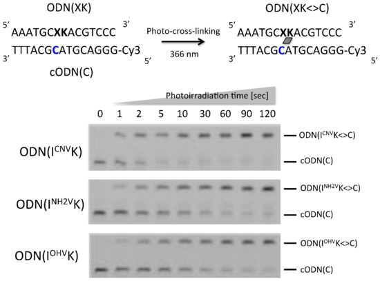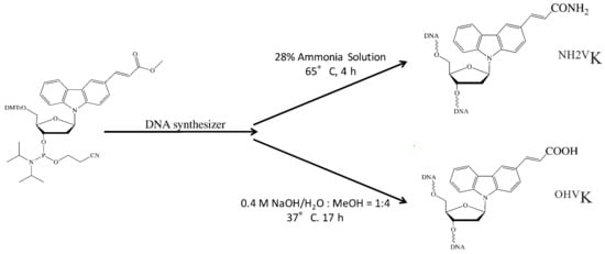 - Sakamoto, T.; Ooe, M.; Fujimoto, K. Critical Effect of Base Pairing of Target Pyrimidine on the Interstrand Photo-Cross-Linking of DNA via 3-Cyanovinylcarbazole Nucleoside. Bioconj. Chem. 2015, 26, 1475–1478. [Google Scholar] [CrossRef] [PubMed]