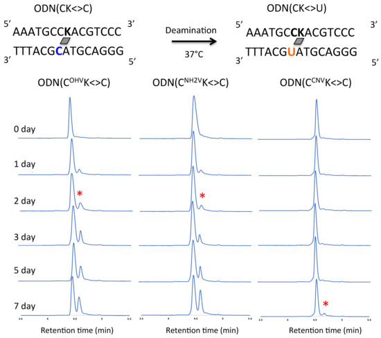 - Sethi, S.; Ooe, M.; Sakamoto, T.; Fujimoto, K. Effect of nucleobase change on cytosine deamination through DNA photo-cross-linking reaction via 3-cyanovinylcarbazole nucleoside. Mol. BioSyst. 2017, 13, 1152–1156. [Google Scholar] [CrossRef] [PubMed]