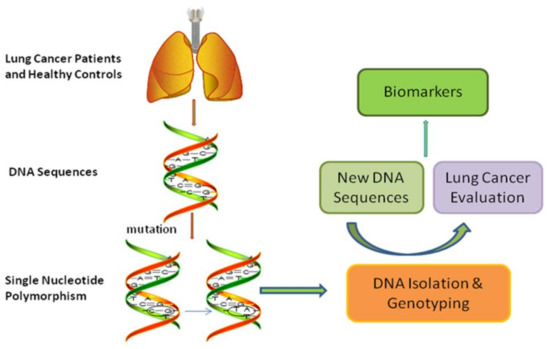 Lung cancer with high morbidity and mortality is one of the most malignant cancers around the world. Therefore, reducing the morbidity and mortality becomes an important challenge for the public healthcare. The development and progression of lung cancer contain multiple processes which could be affected by environmental factors and genetic or epigenetic regulations. Genetic mutations involve in the tumorigenesis, cancer progression and prognosis while SNPs could regulate the expression of gene or affect gene’s functions and then alter the phenotypes.