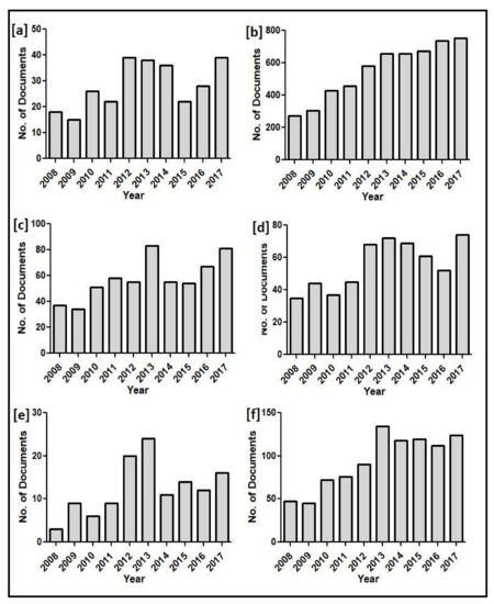 An extensive literature survey was conducted over the last 10 years on aging-associated diseases and their treatment strategies using the drug curcumin. Atherosclerosis-curcumin, cancer-curcumin, cardiovascular diseases-curcumin, chronic inflammation-curcumin, chronic kidney diseases-curcumin, diabetes-curcumin, hypertension-curcumin, neurodegenerative diseases-curcumin, ocular diseases-curcumin, osteoporosis-curcumin, and rheumatoid arthritis-curcumin were used as keywords to search the “Scopus” database for the period 2008–2017, and the results are represented in Figure 2. The literature study describes the annual publication history and the recent research progress of curcumin in relation to the above-mentioned aging-associated diseases.