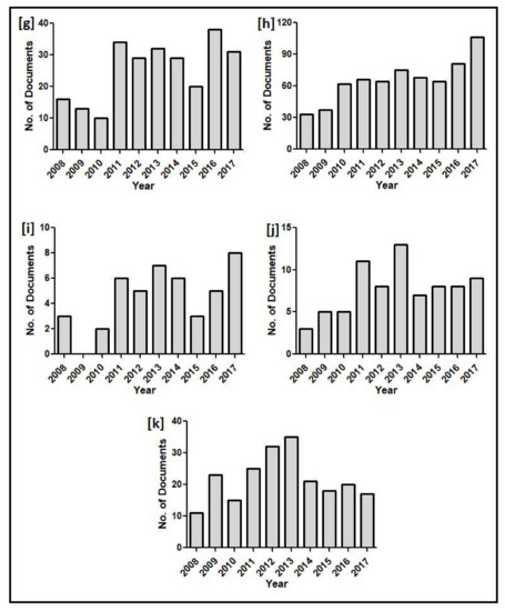 Annual publication history (2008–2017) of curcumin with different aging-associated diseases generated from the “Scopus” database, using the keywords (a) atherosclerosis-curcumin, (b) cancer-curcumin; (c) cardiovascular diseases-curcumin (d) chronic inflammation-curcumin; (e) chronic kidney diseases-curcumin; (f) diabetes-curcumin; (g) hypertension-curcumin; (h) neurodegenerative diseases-curcumin; (i) ocular diseases-curcumin; (j) osteoporosis-curcumin; and (k) rheumatoid arthritis-curcumin.