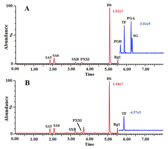 Except for DS with purity at about 95.3%, the reference standards with purity above 98% including SA5, SA6, SXB, PXXI, PGD, TF, PGA, and SG were obtained from Chengdu Pufei De Biotech Co., Ltd (Sichuan, China).