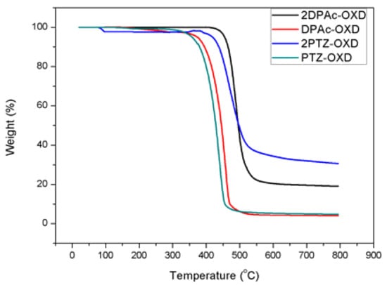 The thermal stabilities of four fluorescence emitters were studied on the basis thermal decomposition temperature at 5% weight reduction and were measured by using thermo gravimetric analysis (TGA). All four emitters, which are depicted in Figure 1 exhibited higher decomposition temperature over 358 °C. The acridine donor-based emitters, DPAc-OXD and 2DPAc-OXD showed thermal stability of 375 and 455 °C, respectively. The above values are higher than that of phenothiazine donor based PTZ-OXD (358 °C) and 2PTZ-OXD (419 °C) due to its higher rigidity when compare to acridine donor-based molecules (Table 1). Additionally, we noticed that two site molecules (2PTZ-OXD, 2DPAc-OXD) were excellent with their thermal strength while the thermal strength of single site molecules (PTZ-OXD, DPAc-OXD) were lower.