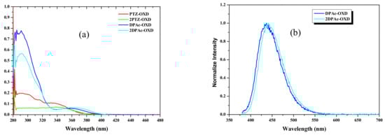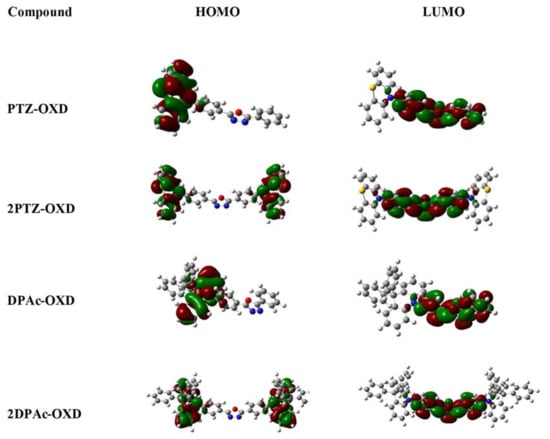 Triazine, oxadiazole, triazole, cyno-substituted benzene and benzothiadiazole are usually used as acceptor units, while carbazole, arylamine, phenothiazine and their derivatives are commonly adopted as the donor moieties for bipolar structures for OLEDs [15,16,17,20,23,24,25,26,27,28,29]. Herein, we utilize phenothiazine and 9,9-diphenyl-9,10-dihydroacridine as the donor unit, while oxadiazole derivatives 2,5-bis(4-bromophenyl)-1,3,4-oxadiazole and 2-(4-bromophenyl)-5-phenyl-1,3,4-oxadiazole are employed as the acceptors to synthesize four distorted A-D and D-A-D type fluorescent materials, 2,5-bis(4-(10H-phenothiazin-10-yl)-1,3,4-oxadiazole (2PTZ-OXD), 2-(4-(10H-phenothiazin-10-yl)-1,3,4-oxadizaole (PTZ-OXD), 2,5-bis(4-(9,9-diphenyl-9,10-dihydroacridine)phenyl)-1,3,4-oxadizaole (2DPAc-OXD) and 2-(4-(9,9-diphenyl-9,10-dihydroacridine)phenyl)-1,3,4-oxadiazole (DPAc-OXD). We also investigated their photophysical properties, thermal stability and performed quantum calculations to evaluate the molecular orbitals distribution for all molecules.