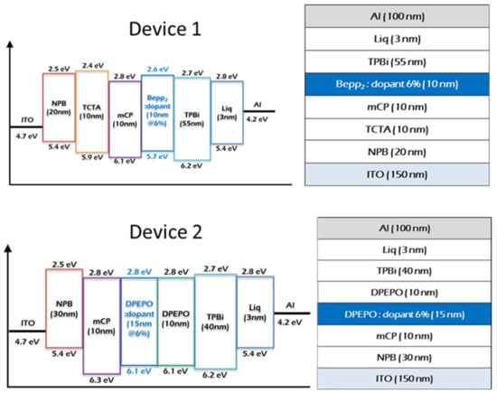 The device substrate was made by using an ITO (indium tin oxide) with the thickness of 150 nm. Then substrate was subjected to ultra-sonication with isopropyl alcohol and deionized water, followed by ultraviolet and ozone treatment. Further device fabrication continued as follow: 4,4′-bis(N-phenyl-1-naphthylamino)biphenyl (NPB) was used as hole transporting material (HTM), 1,3-bis(N-carbazolyl)benzene (mCP) was used for exciton blocking layer, bis[2-(diphenylphosphino)phenyl] ether oxide (DPEPO) and bis[2-(2-pyridinyl)phenolato]beryllium(II) (Bepp2) host materials doped with 6% fluorescence emitters, 2,2′,2″-(1,3,5-benzinetriyl)-tris(1-phenyl-1-H-benzimidazole) (TPBI) was electron transporting material, 8-quinolinolato lithium (Liq) used for hole injecting material and aluminium was used for cathode with thickness of 100 nm. All organic layers were deposited by thermal evaporating system under 5 × 10−7 torr pressure (Sunicel plus, Seoul, Republic of Korea). The active area of the devices were 2 mm × 2 mm.
