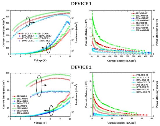 Current density-voltage-luminance (J-V-L) and luminescence -current and power efficiency of the fabricated Devices 1 and 2.