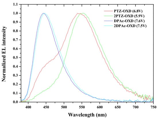 The photophysical properties were analysed by using UV-visible and photoluminescence spectral measurements. UV-Vis spectra showed on set values of 376, 384, 396 and 402 nm for PTZ-OXD, 2PTZ-OXD, DPAc-OXD and 2DPAc-OXD, respectively which were used to calculate the band gap energies of four emitters (Figure 2). The above values are summarized in Table 1. The triplet energy of PTZ-OXD, 2PTZ-OXD, DPAc-OXD and 2DPAc-OXD were 2.48, 2.42, 2.85 and 2.81 eV, respectively. Those above values were evaluated from phosphorescence emission spectrum according to literature [33]. The triplet energy values were matched with their photoluminescence (PL) emission of 500 (PTZ-OXD), 512 (2PTZ-OXD), 435 (DPAc-OXD) and 442 nm (2DPAc-OXD). When we noticed the PL values of phenothiazine donor-based molecules, PTZ-OXD and 2PTZ-OXD were revealed bathochromic shift related to their lower triplet energy. HOST material is one of the key factors for enhancing the device efficiencies by controlling holes and electrons balance at the emission layer. We have fabricated two different OLED devices with different host materials of Bis[2-(2-pyridinyl)phenolato]beryllium(II) (Bepp2) and Bis[2-(diphenylphosphino)phenyl] ether oxide (DPEPO), which have higher triplet energy of 2.70 and 2.99 eV for latest [34,35]. DPEPO host material has enough potential to prevent the energy transferring from dopant to host due to its higher triplet energy than our fluorescence emitters. In the case of Bepp2 host material, it can effectively work with PTZ-OXD and 2PTZ-OXD due to their lower triplet energies.