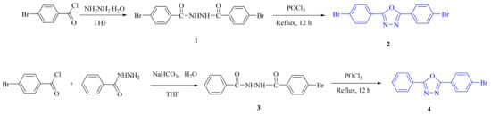 The synthesis of 2-(4-bromophenyl)-1,3,4-oxadiazole is similar with OXD-2Br, and the only difference lies in the starting material 4-bromo-N′-(4-bromobenzoyl)benzohydrazide to N′-benzoyl-4-bromobenzohydrazide. After recrystallization, white crystals were filtered and dried in the oven.