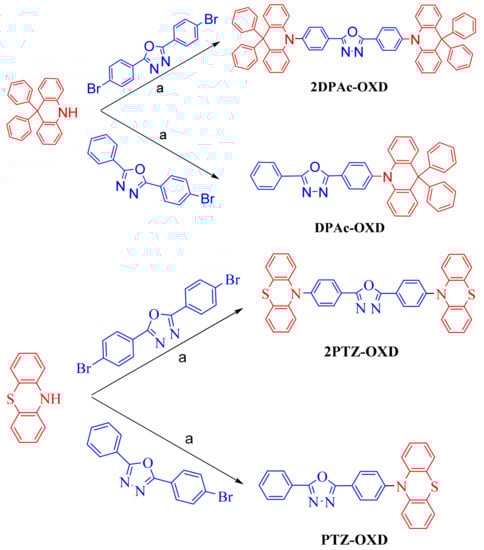 Synthesis of 2,5-bis(4-(9,9-diphenyl-9,10-dihydroacridine)phenyl)-1,3,4-oxadizaole (2DPAc-OXD), 2-(4-(9,9-diphenyl-9,10-dihydroacridine)phenyl)-1,3,4-oxadiazole (DPAc-OXD), 2,5-bis(4-(10H-phenothiazin-10-yl)-1,3,4-oxadiazole (2PTZ-OXD) and 2-(4-(10H-phenothiazin-10-yl)-1,3,4-oxadizaole (PTZ-OXD). Reagents and conditions (a): Pd(OAc)2, K2CO3, t-Bu3P, anhydrous toluene, 110 °C.