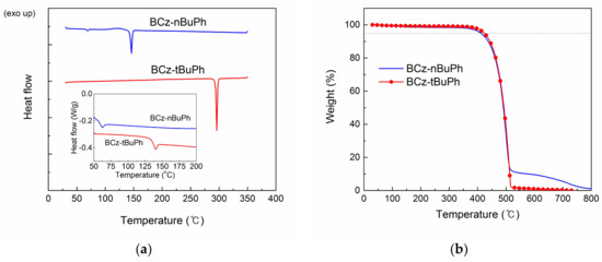 On the other hand, with regard to the film PL spectra (Figure 2b), BCz-nBuPh exhibited a relatively broad shoulder emission peak over 450 nm compared to BCz-tBuPh. Because the n-butyl group in BCz-nBuPh exhibited less steric hindrance than the t-butyl group in BCz-tBuPh, molecules of BCz-nBuPh within the film exhibited a strong degree of molecular aggregation. t-Butyl groups have been introduced to blue emitting molecules to prevent molecular quenching [21,22]. BCz-tBuPh with t-butyl groups was expected to yield better host materials than BCz-nBuPh with regard to thermal and optical properties.