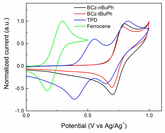 The electrochemical properties of the two host molecules and N,N′-bis(3-methyl-phenyl)-[l,l′-biphenyl]-4,4′-diamine (TPD) were measured via cyclic voltammetry (CV) measurements (Figure 3). The ionization potential (IP) energy levels of the molecules were estimated according to an empirical relationship: E(IP) = E[ox, onset vs. Fc/Fc+] + 5.1 (eV) [23,24,25], where E[ox, onset vs. Fc/Fc+] (V) is the onset potential of oxidation versus the redox potential of ferrocene/ferrocenium. The oxidation potentials of the two host molecules were almost the same. The IP energy levels were estimated to be 5.55 eV for both BCz-nBuPh and BCz-tBuPh. The thermal, optical, and electrochemical properties of the molecules are summarized in Table 1.