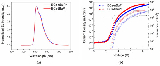 The device configuration was indium tin oxide (ITO) (150 nm)/poly(3,4-ethylenedioxy thiophene):poly(4-styrenesulfonate (PEDOT:PSS) (35 nm)/spin-coated EML (20 nm)/1,3,-bis(3,5-dipyrid-3-yl-phenyl)benzene (BmPyPB) (50 nm)/LiF (0.7 nm)/Al (70nm). As shown in Figure 4a, PHOLEDs using BCz-nBuPh and BCz-tBuPh exhibited green emission of Ir(mppy)3 with an emission maximum at 510 nm. Figure 4b–d present OLED characteristics, such as the current density-voltage-luminance (J-V-L) curves and efficiency-luminance curves. Table 2 summarizes the OLED performance. Devices with BCz-tBuPh exhibited maximum current efficiency (CE), power efficiency (PE), and external quantum efficiency (EQE) values of 43.1 cd/A, 40.0 lm/W, and 12.5%, respectively; devices with BCz-nBuPh exhibited values of 30.8 cd/A, 28.1 lm/W, and 8.8%, respectively. Moreover, devices with BCz-tBuPh exhibited a high current efficiency of 42.8 cd/A and 38.8 cd/A at 100 and 1000 cd/m2 of the display-relevant luminance range, respectively. The efficiency of BCz-tBuPh was lower than the highest reported efficiency in solution-processed green PHOLEDs, but comparable to the efficiency of devices based on several newly synthesized host materials [18,27].