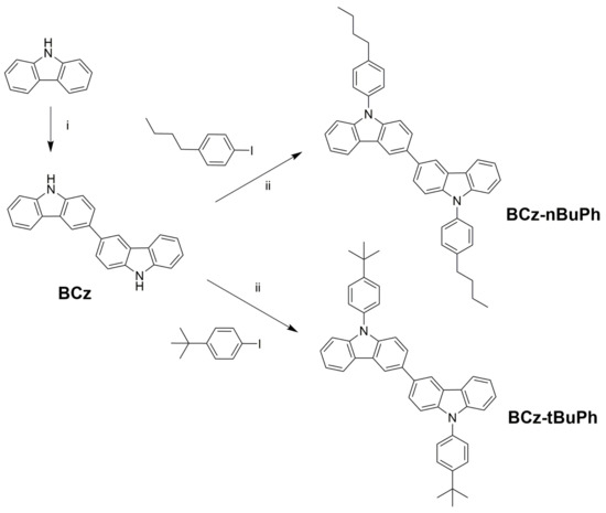 The synthetic routes and chemical structures for 3,3′-bicarbazole (BCz), BCz-nBuPh, and BCz-tBuPh can be seen in Scheme 1. Initially, 3,3′-bicarbazole was obtained via the chemical oxidative coupling of carbazoles in the presence of FeCl3 according to a procedure described in the literature [20]. Additionally, a detailed reduction procedure using zinc powder can be found in the materials section. The designed new host molecules, BCz-nBuPh and BCz-tBuPh, were synthesized through an Ullmann coupling reaction between 3,3′-bicarbazole and two iodobenzenes with n-butyl and t-butyl groups, respectively. The two compounds with alkyl groups were much more soluble in common organic solvents, such as chloroform and toluene, compared to the intermediate compound, BCz.
