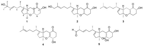 1D and 2D NMR spectra, and HR-ESI-MS spectrum for compound 1, 1H and 13C-NMR spectra for 2, 1H-NMR spectra for 3–5, and LR-ESI-MS spectra for 2–5 are available online.
