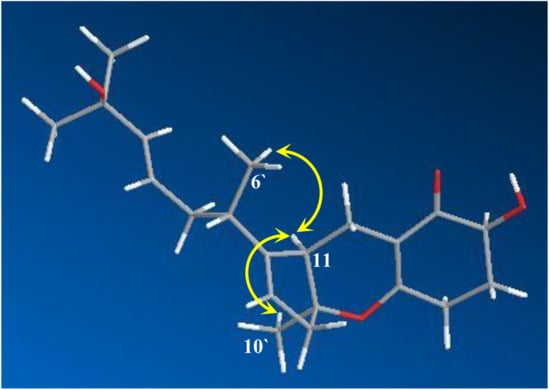 The configuration of the double bond between C-3 and C-4 in compound 1 was determined as E based on its 3J3–4 value of 15.6 Hz. Its relative configuration was established on the basis of the important NOESY correlations of H-11 to H3-6′ and H3-10′ (Figure 3) and the optical rotation ( = +78°), which was similar to that of compound 2. Hence, 1 was identified as a new natural product and named as TCA 14b.