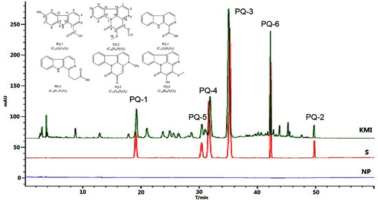 Sample Availability: Samples of the KMI and the compounds 6-hydroxy-β-carboline-1-carboxylic acid (PQ-1), 4,5-dimethoxycanthin-6-one (PQ-2), β-carboline-1-carboxylic acid (PQ-3), β-carboline-1-propanoic acid (PQ-4), 3-methylcanthin-5,6-dione (PQ-5), and nigakinone (PQ-6) are available from the authors. |