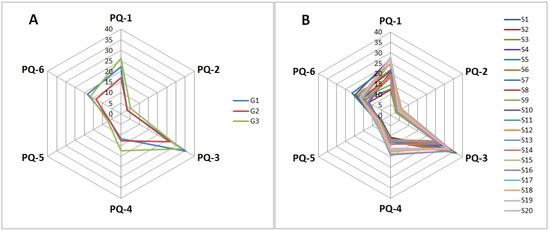 Radar plots showing the difference of geographical origins in terms of six components in various KMI samples; (A) G1, G2, and G3. (B) The distribution of the chemical composition of 20 KMI samples.