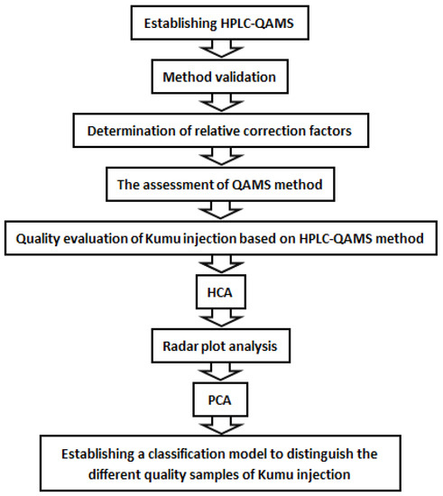 An accessible HPLC–QAMS method was established for quality evaluation of KMI in the present study. HPLC fingerprints were performed at first to separate the index compositions from KMI. The RCFs then were calculated after systemic method validation for investigation of the stability, precision, repeatability, reproducibility, recovery, and so on. Furthermore, the applicability and feasibility were assessed by paired t-test of the results from the QAMS method and those from the ESM. Finally multivariate analyses such as HCA, radar plot analysis, and PCA were conducted for sample classification and quality assessment of KMI based on the contents of six alkaloids (Figure 5).