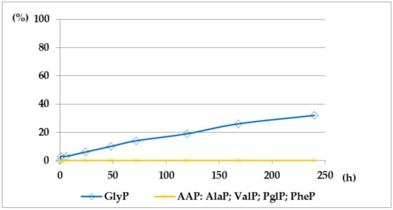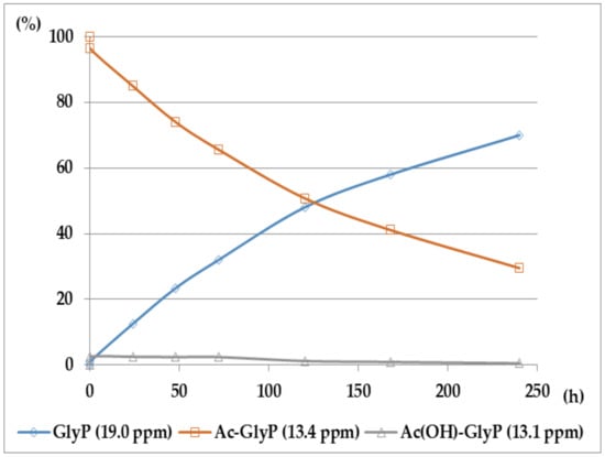The application of 31P NMR monitoring of the reaction course enabled identification and quantification of phosphoric components of the reaction mixtures formed. Essentially, monitoring of the deacylation course of Ac-GlyP in 2M KOH solution reveals the formation of GlyP (Figure 3). The results of 31P NMR monitoring of the deacylation of the various types of (AC)-AAP (Ac-AAP, Bz-AAP and TFA-AAP) at a temperature of 25 °C and exposition period up to 240 h are presented in Figure 4 (Ac-AAP), Figure 5 (TFA-AAP) and Figure 6 (TFA-AAP), respectively.
