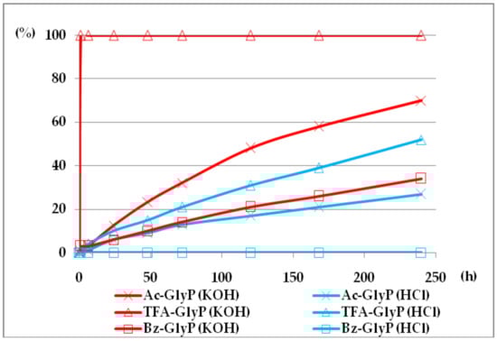 The comparison of hydrolytic stability of TFA-GlyP, Ac-GlyP and Bz-GlyP in 2M KOH is presented in Figure 7.