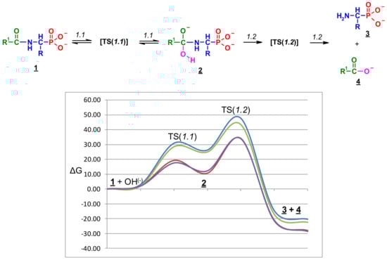 The total Gibbs free energy profiles of entire process 1 for two selected pairs of 1-(acylamino)alkylphosphonic acids [Ac-AlaP(2−), TFA-AlaP(2−) , Bz-PglP(2−) and TFA-PglP(2−)] in water solution are shown in Figure 12.