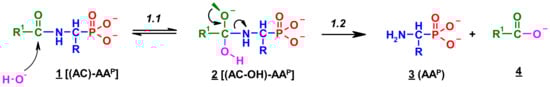 Since no products of the scission of the C-P bond in all investigated cases were observed, the deacylation mechanism of (AC)-AAP in alkaline solutions can be illustrated by an analogy to the corresponding basic deacylation of 1-(acylamino)alkanoic acids (Scheme 1) [54,62,63].