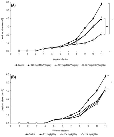 Treatment of experimental infection in BALB/c mice caused by Leishmania (L.) amazonensis. Mice were inoculated subcutaneously, in the left footpad, with 1.0 × 104 promastigotes at the logarithmic phase of growth. After 4 weeks of infection, mice were treated daily with meglumine antimoniate (A) or epoxymethoxylawsone (B) at three different concentrations administered subcutaneously in groups with five animals. The control group was treated with a mix of DMSO/propylene glycol/saline (1:9:10). The lesion sizes were measured weekly and the results are represented as means with standard deviations from three independent experiments. Analyzed points exhibited significant differences from the control, (*) p ≤ 0.03, and with the groups, (**) p ≤ 0.02.