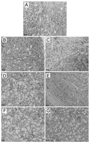 Analysis of mice lesions by light microscopy. Semithin sections of mice skin lesions of untreated (A) and treated groups with three doses of meglumine antimoniate (B: 22.7 mg of Sb(V)/kg/day; D: 2.27 mg of Sb(V)/kg/day; F: 0.23 mg of Sb(V)/kg/day) and epoxymethoxylawsone (C: 11.4 mg/kg/day; E: 1.14 mg/kg/day; G: 0.11 mg/kg/day). Lesions were extracted one week after the end of a four weeks treatment course. The images are representatives of ten fragments of each group mice.