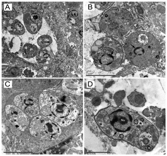Transmission electron microscopy of mice skin lesion. The ultrastructural analysis of amastigotes from lesion were performed in untreated (A) or mice treated with meglumine antimoniate or epoxymethoxylawsone at higher doses (22.7 mg of Sb(V)/kg/day and 11.4 mg/kg/day, respectively). In (A): amastigotes with no morphological changes within parasitophorous vacuoles (PV); bar-shaped kinetoplast (K); nuclei (N) and flagellar pocket (Fp). In (B): Amastigotes (P) show dense nuclear chromatin (thin arrow) with altered profile and absence of nucleoli (→). In (C): Amastigotes (P) with rarefied cytoplasm (*); kinetoplast with an atypical condensation (k) and dense nuclear chromatin (→) and nucleolus (Nu). In (D): Amastigote (P) shows dense nuclear chromatin with altered profile and absence of nucleoli. The images are representatives of ten selections of each group mice.