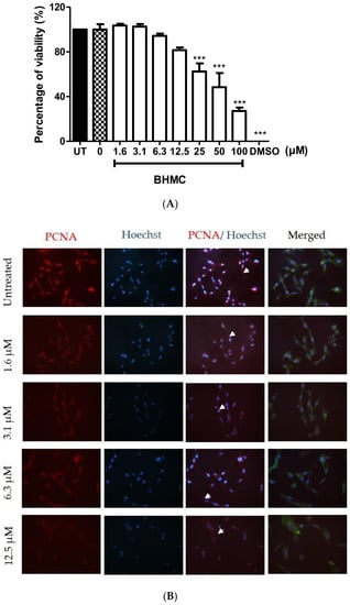 Figure 1A shows the effect of BHMC on MDA-MB-231 cell metabolic activity or cell viability in this study. Treatment with BHMC reduced the cell viability at 25 µM and above on MDA-MB-231 cells. Thus, concentrations of BHMC at 12.5 µM and below were used for subsequent assays to avoid interference resulting from the anti-proliferative effect of BHMC. Treatment of BHMC at 12.5 µM and below was further checked for cell proliferation with the presence of proliferating cell nuclear antigen (PCNA) antibody. All cells counted in all conditions of BHMC ranging from 1.6 to 12.5 µM expressed PCNA. These are then stained with an antibody for visualization purposes (Figure 1B,C) including the control group.