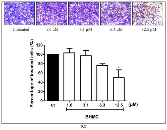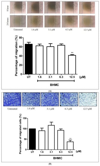 Migration and invasion are important steps in cancer metastasis [31]. Scratch migration assay, transwell migration, and transwell invasion assays were used to investigate the effect of BHMC on the migration and invasion of MDA-MB-231 cells. Treating the cells with BHMC at 12.5 µM (p < 0.01) significantly decreased the migration of MDA-MB-231 cells (Figure 2A). This was confirmed with the results of the transwell migration assay (Figure 2B) in comparison to the untreated group. The transwell migration assay (Figure 2B) shows that BHMC reduced the cell numbers that migrated through the inserts. We also tested the ability of MDA-MB-231 cells to invade the matrix using the transwell invasion assay upon treatment with BHMC. Treatment of BHMC significantly reduced (p < 0.05) the number of invaded cells at 12.5 µM; this is consistent with previous assays (Figure 2C). These findings prove that BHMC prevents the migration and invasion of MDA-MB-231 cells.