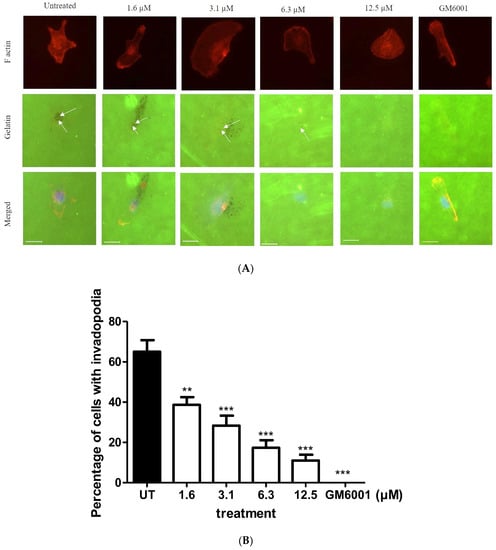 MDA-MB-231 cells have been extensively studied for their potential to successfully form invadopodia when they are placed on a matrix [14,32]. Invadopodia have a dot-like appearance with an actin-rich core in a 2D matrix degradation assay [14]. These dots are the accumulation of many proteins, assembled together to perform their own functions and producing small punctate finger-like projections near the cell nucleus that extend proteolytically into the matrix [14]. We tested the ability of MDA-MB-231 to form invadopodia on Oregon Green 488 gelatin-coated coverslips upon BHMC treatment and found that BHMC reduces the number of cells that form invadopodia in a concentration-dependent manner (Figure 3A,B). GM6001, an MMP-inhibitor, was used to synchronize the formation of invadopodia appearing in MDA-MB-231 cells. There is an absence of invadopodia in all cells upon treatment with GM6001 at 10 µM.