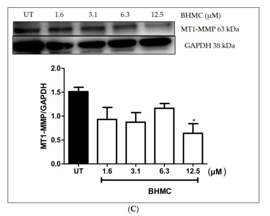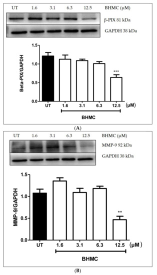Previous studies have demonstrated that migration and invasion are key steps in cancer metastasis [33]. Matrix metalloproteinases (MMPs)-9 have been reported to also be linked with migration and invasion [33,34] and MT1-MMP was revealed to be associated with invasion specifically in the formation of invadopodia [35,36]. Similarly, β-PIX was found to be involved in migration and invasion [37] and in invadopodia formation of breast [38] and ovarian cancer cells [39]. BHMC treatment at a concentration of 12.5 µM significantly reduced the expression of MMP-9 (p < 0.01), MT1-MMP (p < 0.05), and β-PIX (p < 0.001) in MDA-MB-231 cells (Figure 4A–C), which suggests that this compound has the ability to prevent the migration and invasion of MDA-MB-231 especially in reducing the formation of invadopodia.